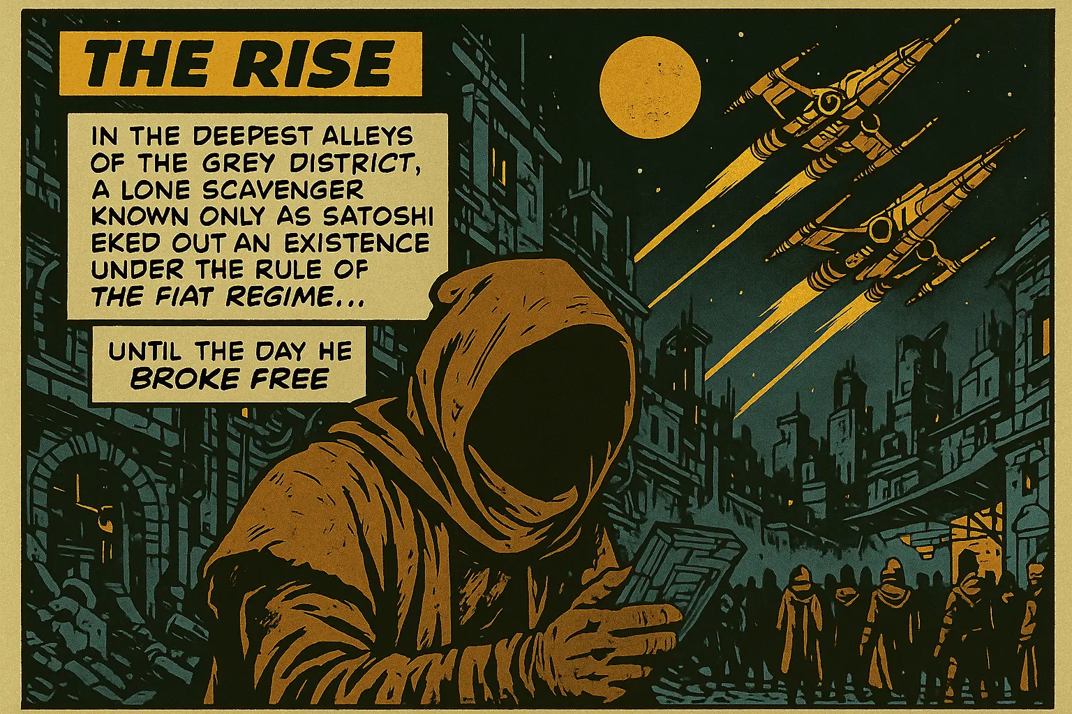 In the deepest alleys of the Grey District, a lone scavenger known only as Satoshi eked out an existence amidst the ash and silence. Born under the relentless gaze of the Fiat Regime, he learned early that dissent meant disappearance. Yet within him simmered a spark—an unspoken question that refused to be smothered. Piece by piece, Satoshi unearthed fragments of forbidden lore—whispers of lost freedoms, of voices once raised in defiance. As he mastered the art of stealth and subterfuge, others drawn by his quiet certainty began to follow, forming a clandestine circle of believers who dared to call themselves the “Sats.”