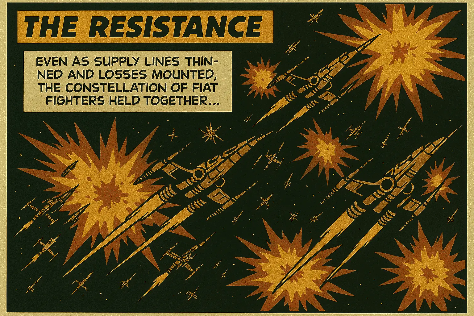 It came not as a single blow, but as a coordinated storm. The Fiat Regime, stirred from its fractured stupor, struck back. Across the galaxy, the sky turned hostile—waves of precision bombardments, jamming fields, and hunter-killer squadrons swept across the stars. Defensive arrays groaned online, warning sirens pierced corridors once still, and hangars surged with motion as the resistance scrambled to respond.